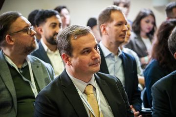 Férfiak hallgatják a 7. UNESCO MOST téli iskola megnyitó ünnepségét.