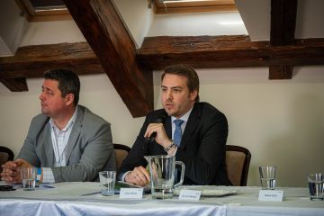 Két férfi a 7. UNESCO MOST Téli Iskola megnyitóján. Laudati Bitosi és Gábor Soós látható az asztalnál.