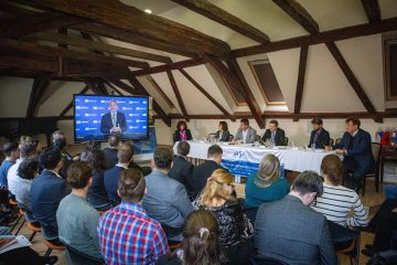 A 7. UNESCO MOST téli iskola nyitóünnepsége: előadók a színpadon, közönség nézi a kivetítőt.