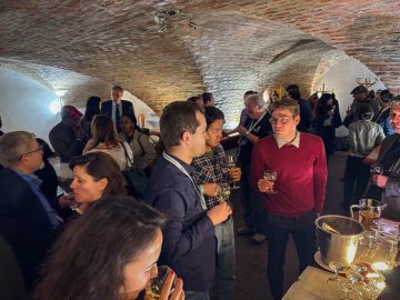 Emberek a UNESCO MOST téli iskola megnyitóján, borral a kezükben.