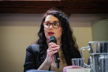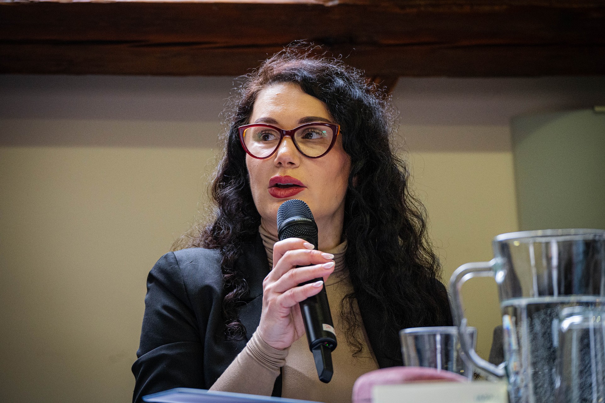 Nő mikrofonnal a "Cultural Heritage, Memory" téli iskola második napján.