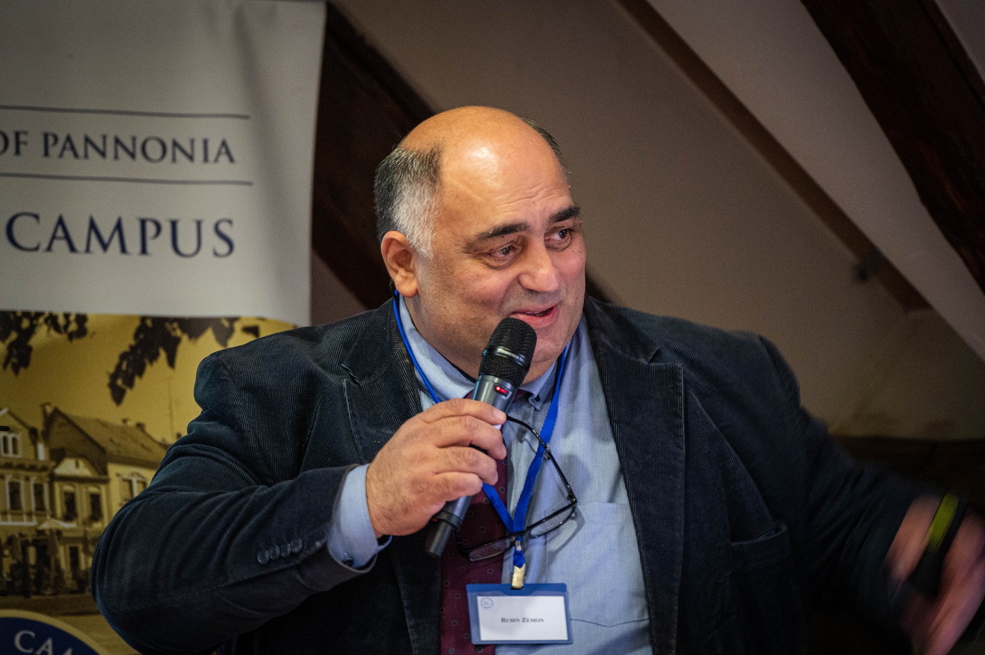 Beszélő férfi a Pannon Egyetem kampuszán, "Rubin Zemon" névtáblával.