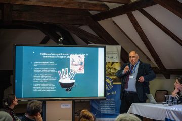 Előadó a "Kulturális örökség" téli iskola második napján, a kivetítőn a kisebbségi jogokról szóló diával.