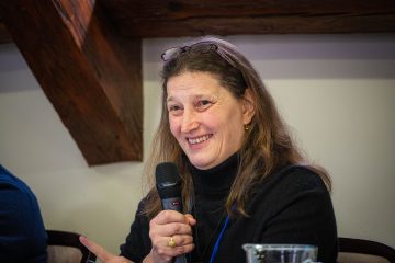 Nő mikrofonnal, mosolyogva. UNESCO MOST téli iskola, technológia, AI, környezeti humán tudományok.