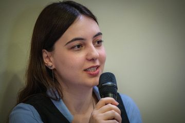 Fiatal nő beszél mikrofonba a 7. UNESCO MOST téli iskola technológia, AI és környezeti humán tudományok témájában.