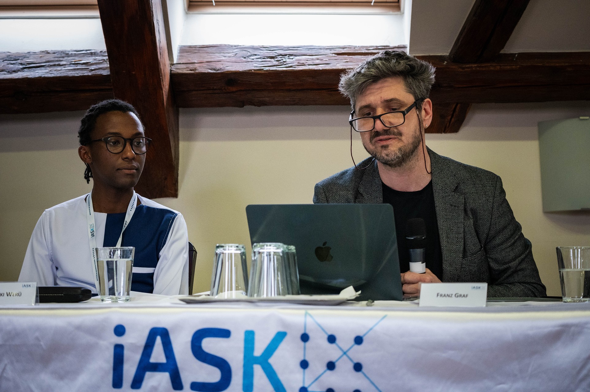 Két előadó az iASK konferencián: Franz Graf beszél, mellette Ari Weild. Technológia és AI téma.