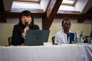 Két előadó a UNESCO MOST Winter School konferencián. Okamoto Sanae beszél a mikrofonba.