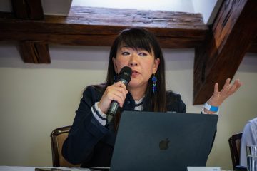 Nő előadást tart, mikrofonnal és laptoppal a 7. UNESCO MOST Téli Iskolán.