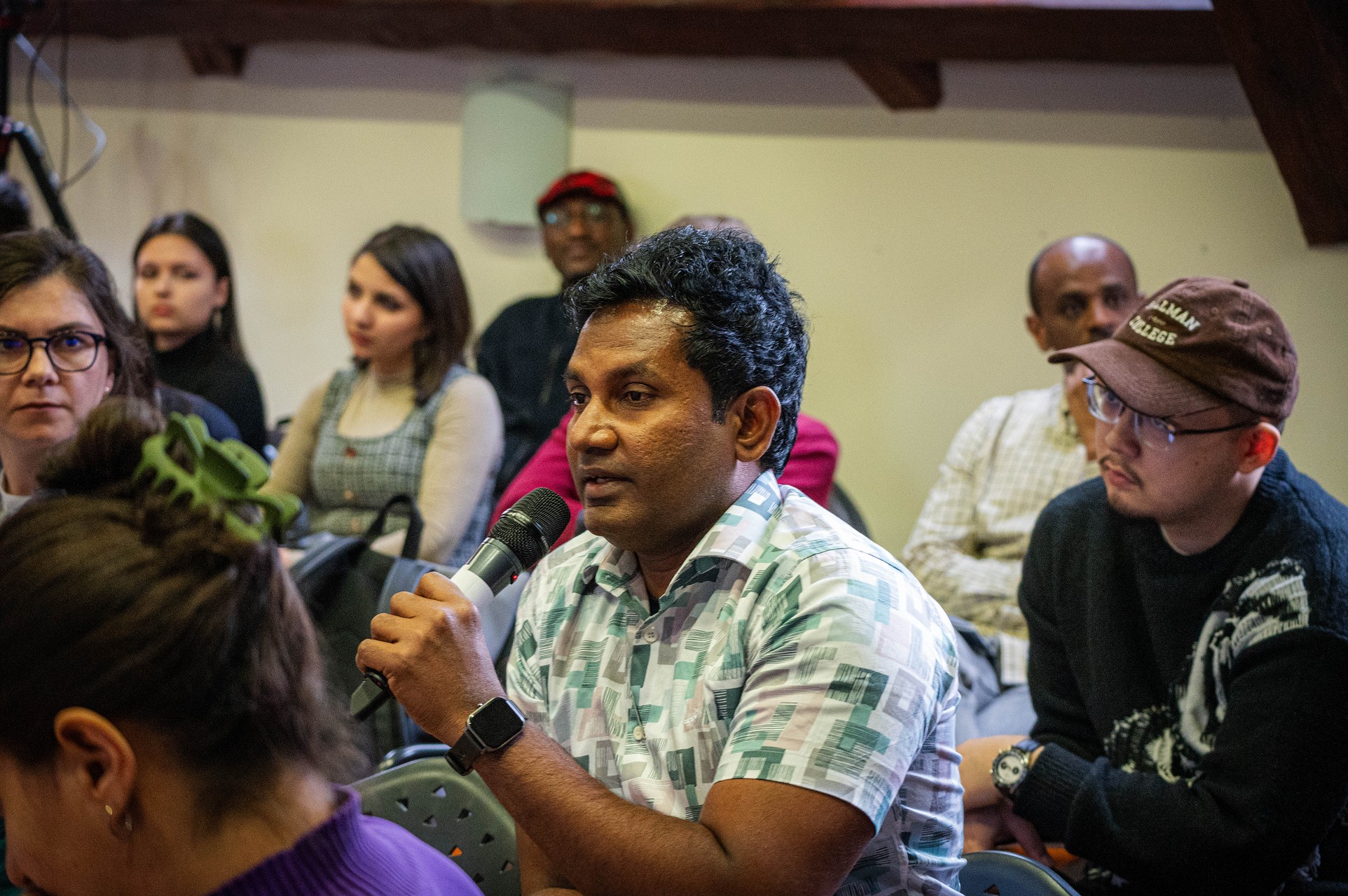 Előadó mikrofonnal a 7. UNESCO MOST téli iskola "Technológia, AI és környezeti humán tudományok" szekciójában.