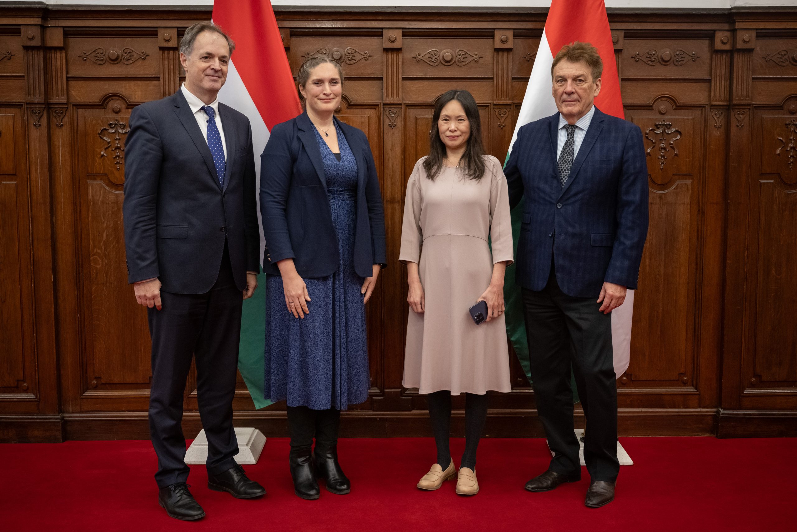 Csoportkép a Kőszegen létesülő ENSZ Egyetem intézetéről, magyar zászlók előtt.