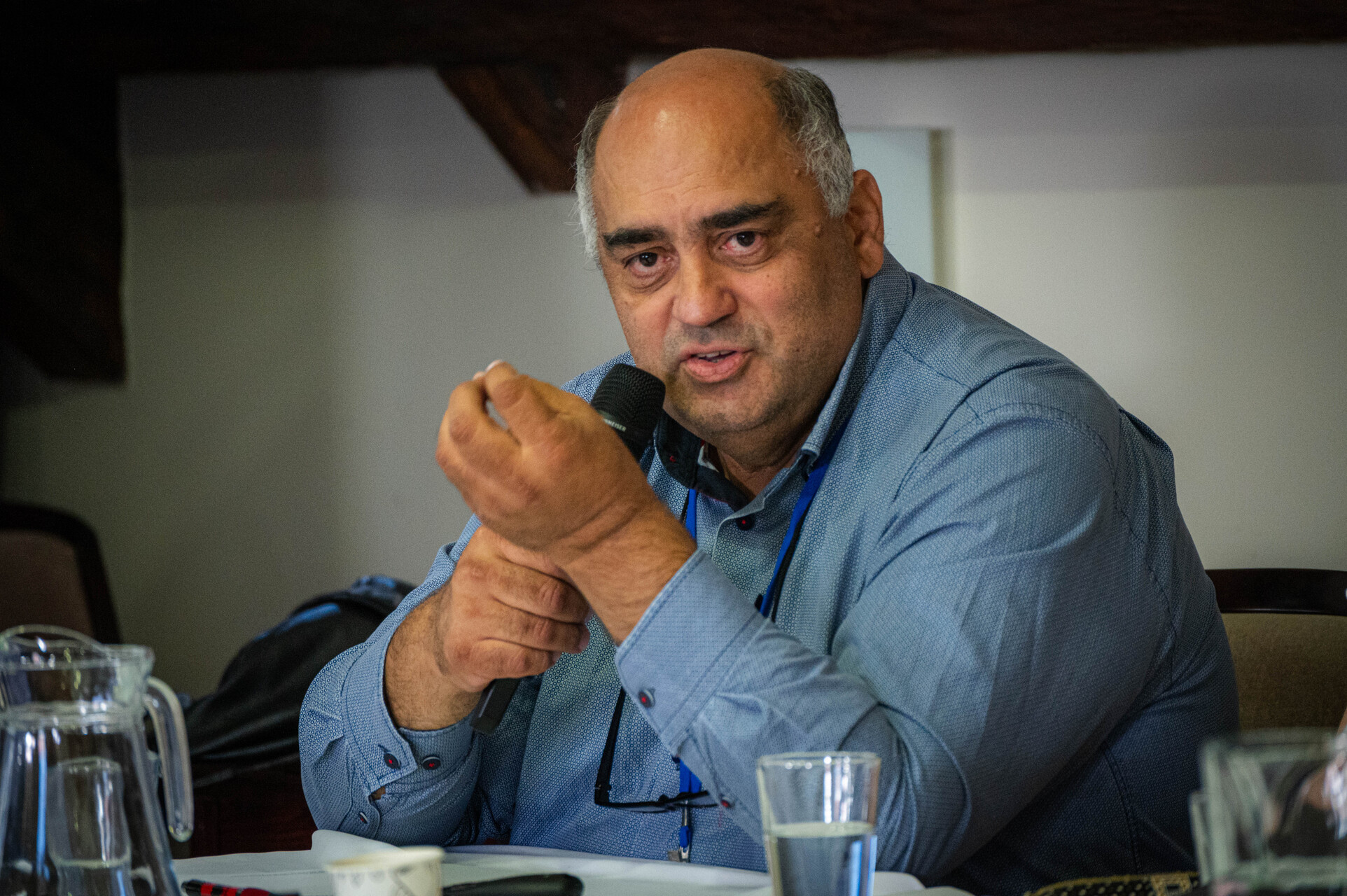 Férfi beszél a 30. Nemzetközi Nyári Egyetem programján, mikrofont tartva.