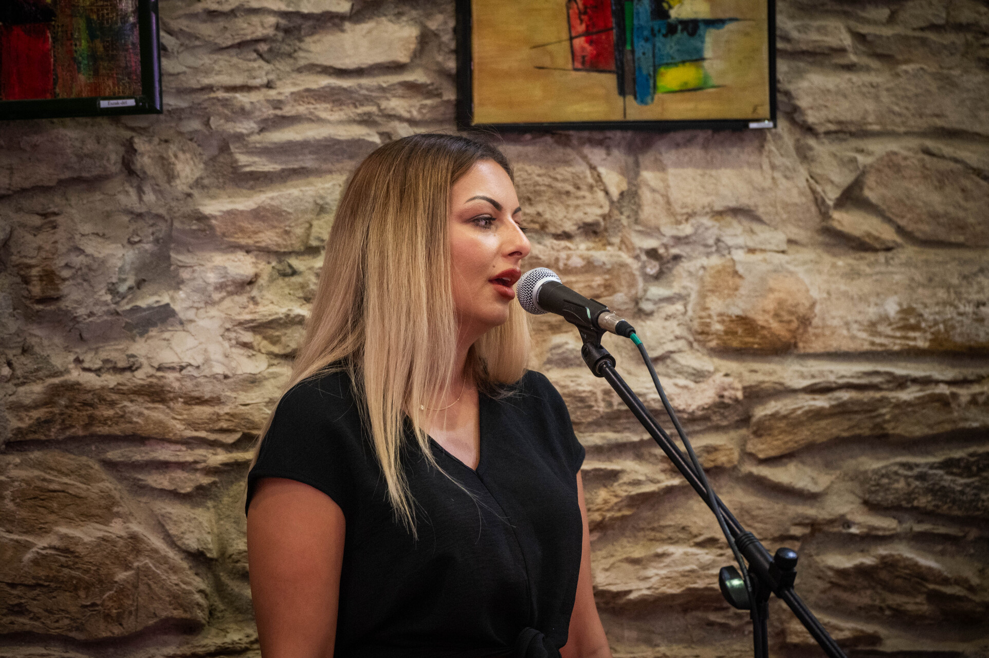 Énekesnő mikrofonnal, a 30. Nemzetközi Nyári Egyetem programján.