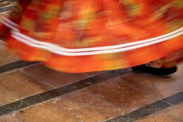 Táncoló nő narancssárga szoknyában, a Nemzetközi Nyári Egyetemi programon.