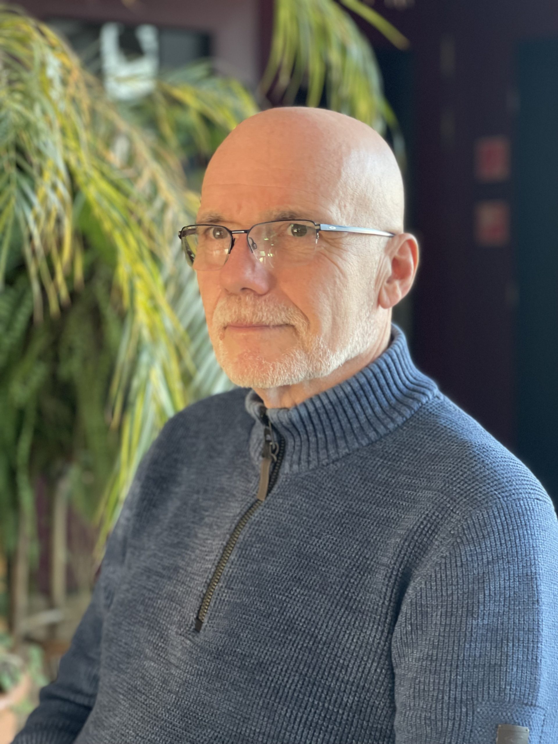 András Nyírő portréja szemüveggel és kék pulóverben, növényekkel a háttérben.