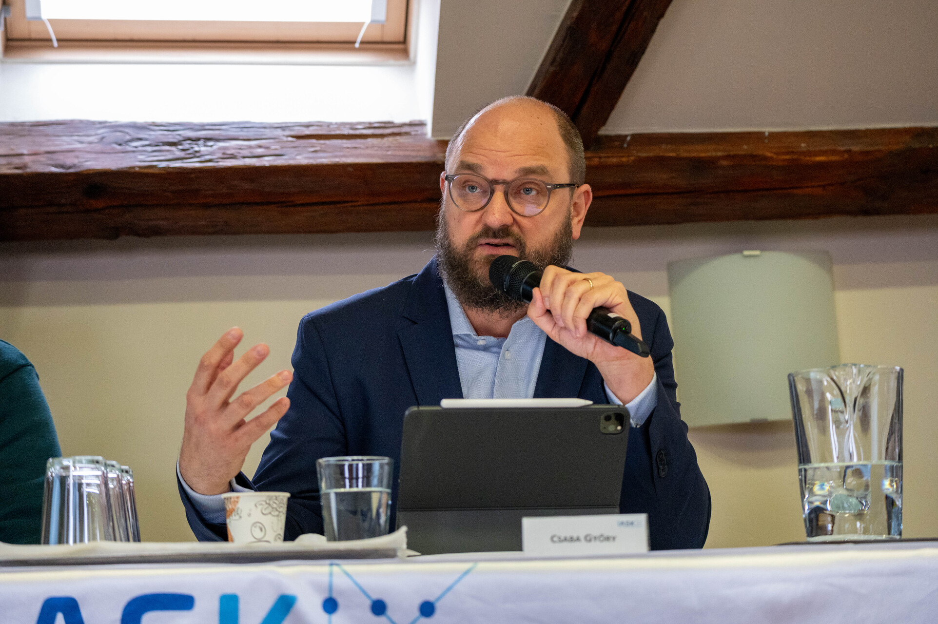 Csaba Győry előadó a 7. UNESCO MOST Winter School-ban. Beszél, mikrofont tart.