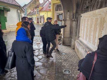 Csoport emberek emléktáblát néz a UNESCO MOST Téli Iskola negyedik napján.