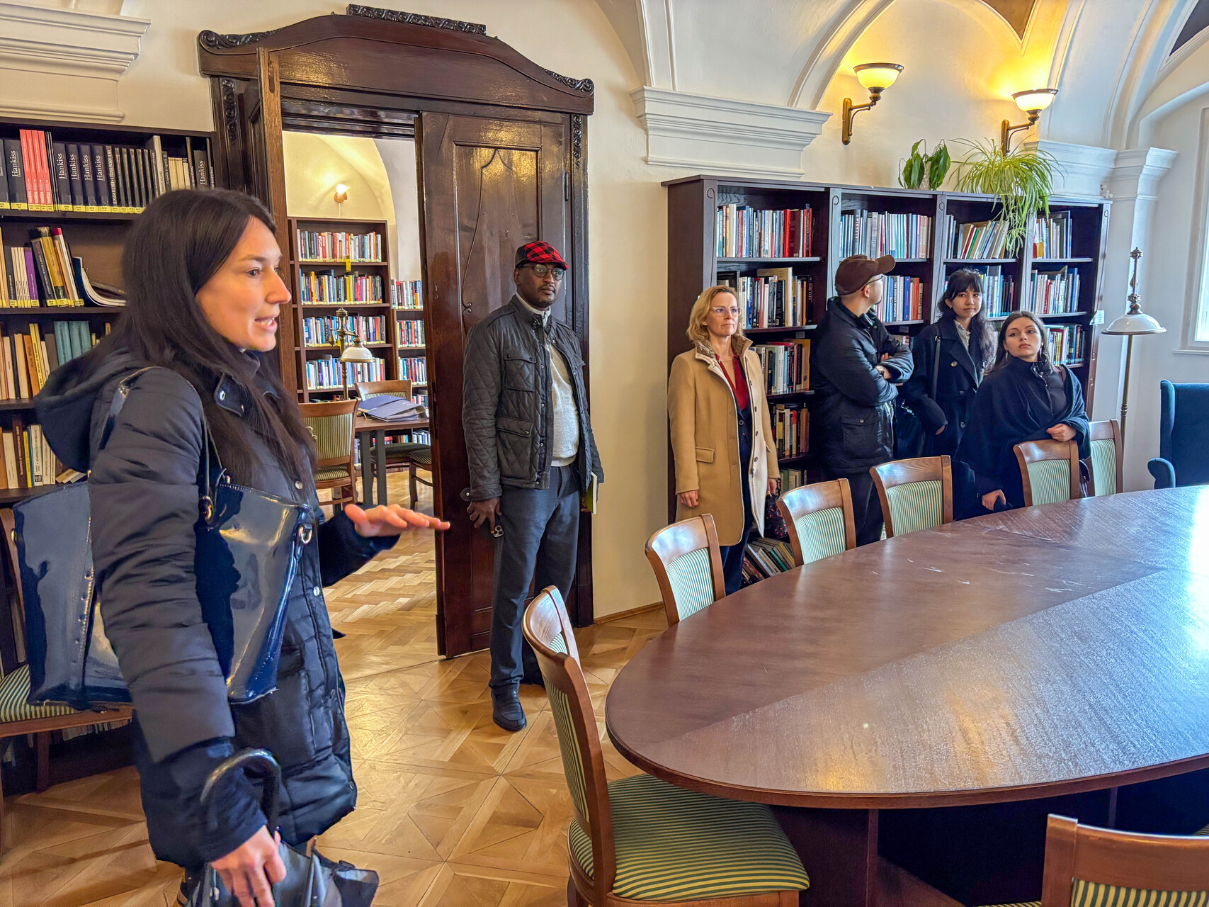 Csoport a UNESCO MOST Téli Iskola 7. napján egy könyvtárban. Globalizáció, jog, jövő.