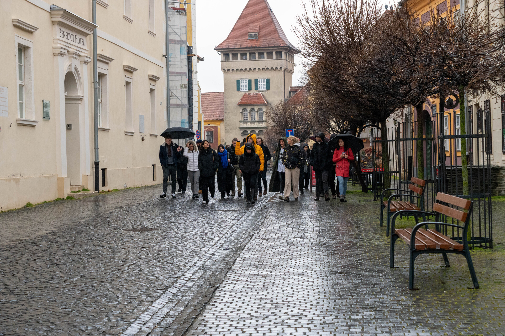 Csoport sétál esernyőkkel az esős utcán, a "Benedict Hotel" és épületek láthatók. UNESCO MOST téli iskola résztvevői.