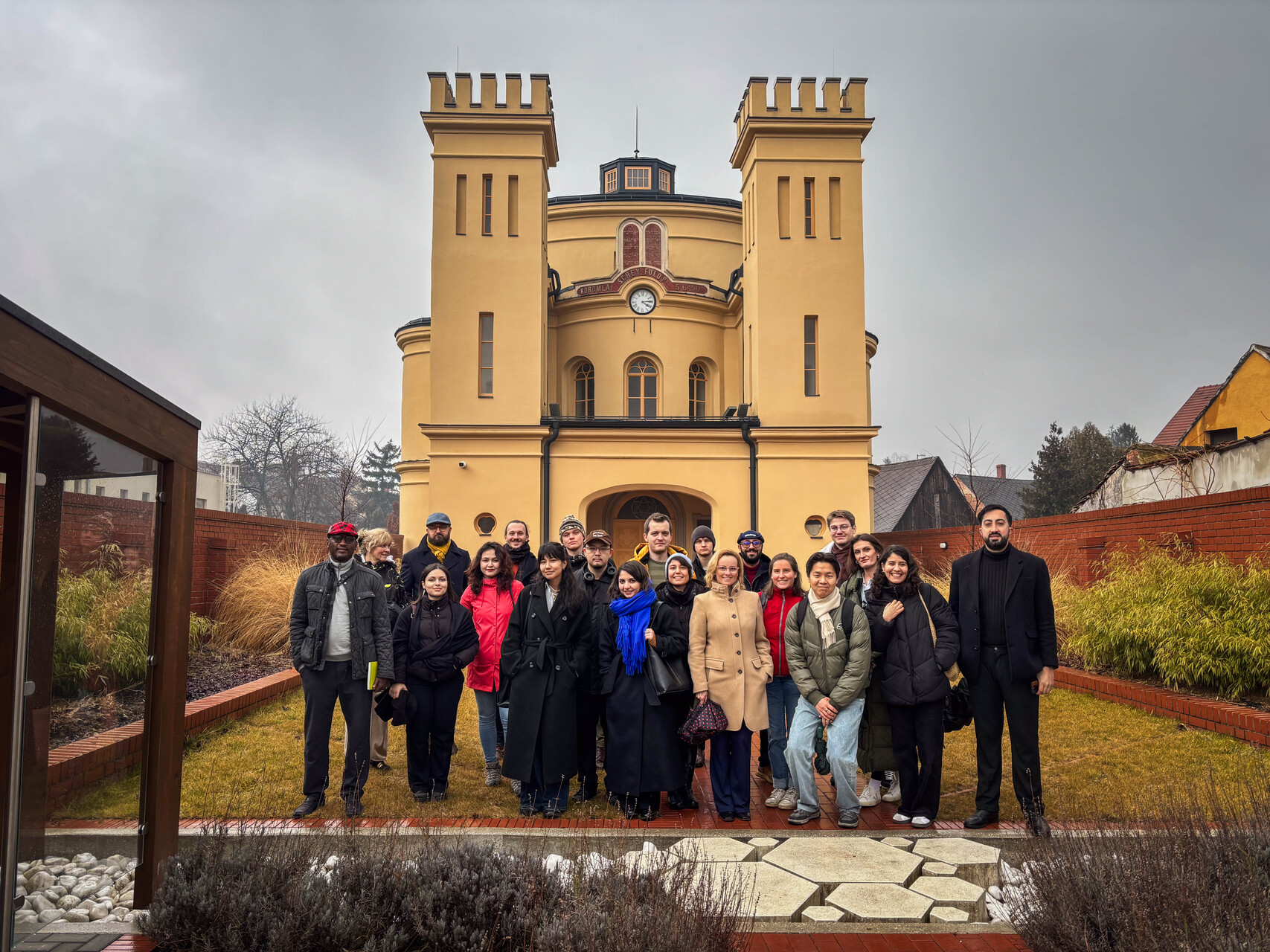Csoportkép a UNESCO MOST Téli Iskola résztvevőiről egy épület előtt.