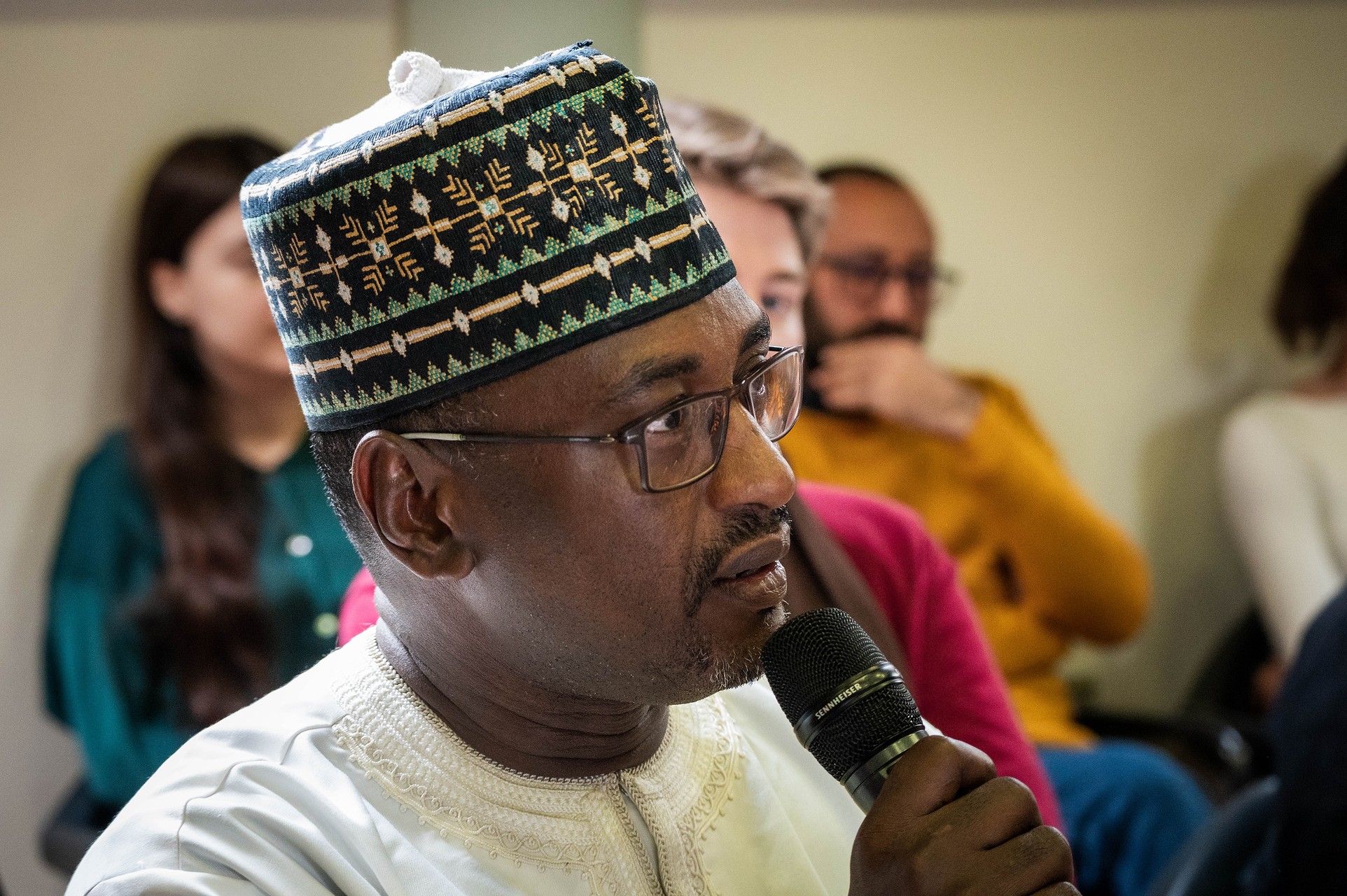 Férfi hagyományos afrikai sapkában, mikrofonnal a "Globalizáció, jog és jövő" UNESCO MOST téli iskolában.