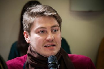 Fiatal férfi beszél mikrofonba a "Globalizáció, jog és jövő irányai" UNESCO MOST téli iskolában.