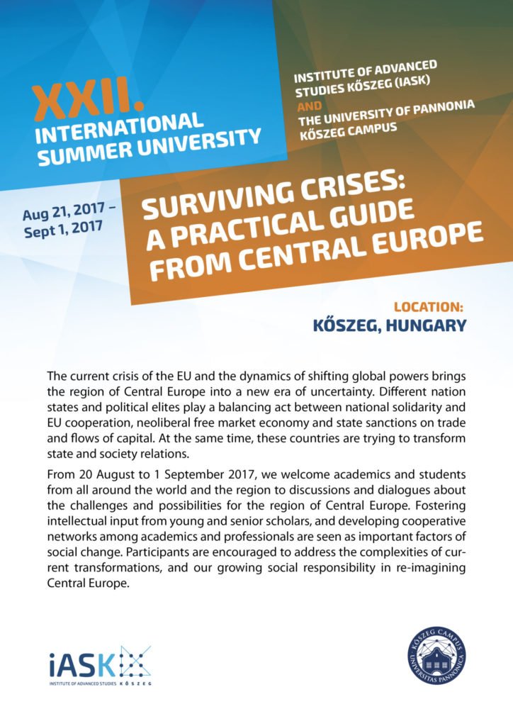 2017-agusztusában közép-európai nézőpontból a világ ügyei kerültek terítékre, különös tekintettel a politikára, a gazdaságra, a környezeti problémákra, melyek ügyei elválaszthatatlanok a kultúrától. 10 nap alatt több mint 70 előadó fordult meg Kőszegen. Első alkalommal került sor az előadások és kerekasztal beszélgetések interneten keresztül történő élő közvetítésére, ami kinyitotta a Zwinger-Öregtorony belső terét, ahol a tanulmányi események zajlottak.