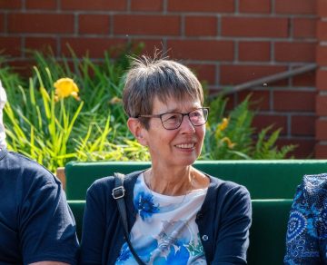 Mosolygó idős nő szemüvegben, a Bodzán Antal szobrai a zsinagógában kiállítás látogatója.