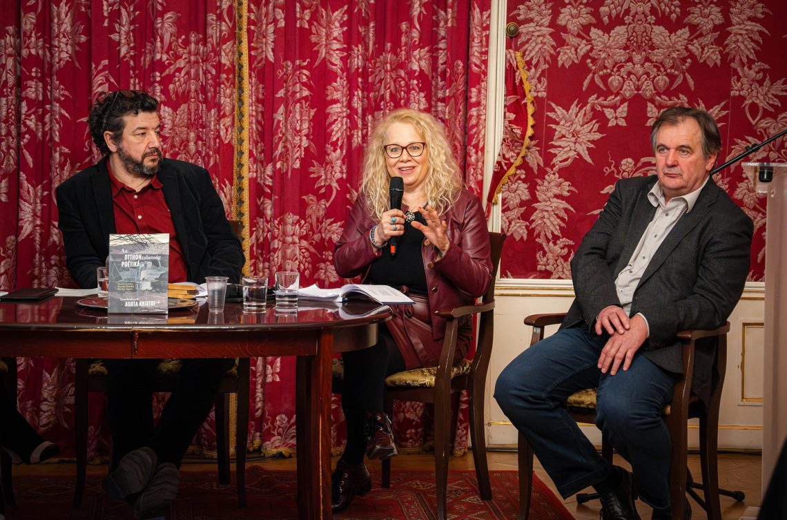 A könyvet Szolláth Dávid irodalomtörténész mutatta be, aki előadásában kiemelte Kristof sajátos helyét a magyar és a világirodalomban, valamint rámutatott a kötet tematikus és módszertani sokszínűségére. Az ezt követő beszélgetésben a kötet szerzői és szerkesztői – Deczki Sarolta, Kovács Ágnes, Szávai Dorottya és Sümegi István – vettek részt. A diskurzus során hangsúlyosan jelentek meg az életmű értelmezésének aktuális kérdései, különös tekintettel a „köztesség” mint létállapot, a nyelvi idegenség, valamint a Trilógia narratív és etikai sajátosságaira.