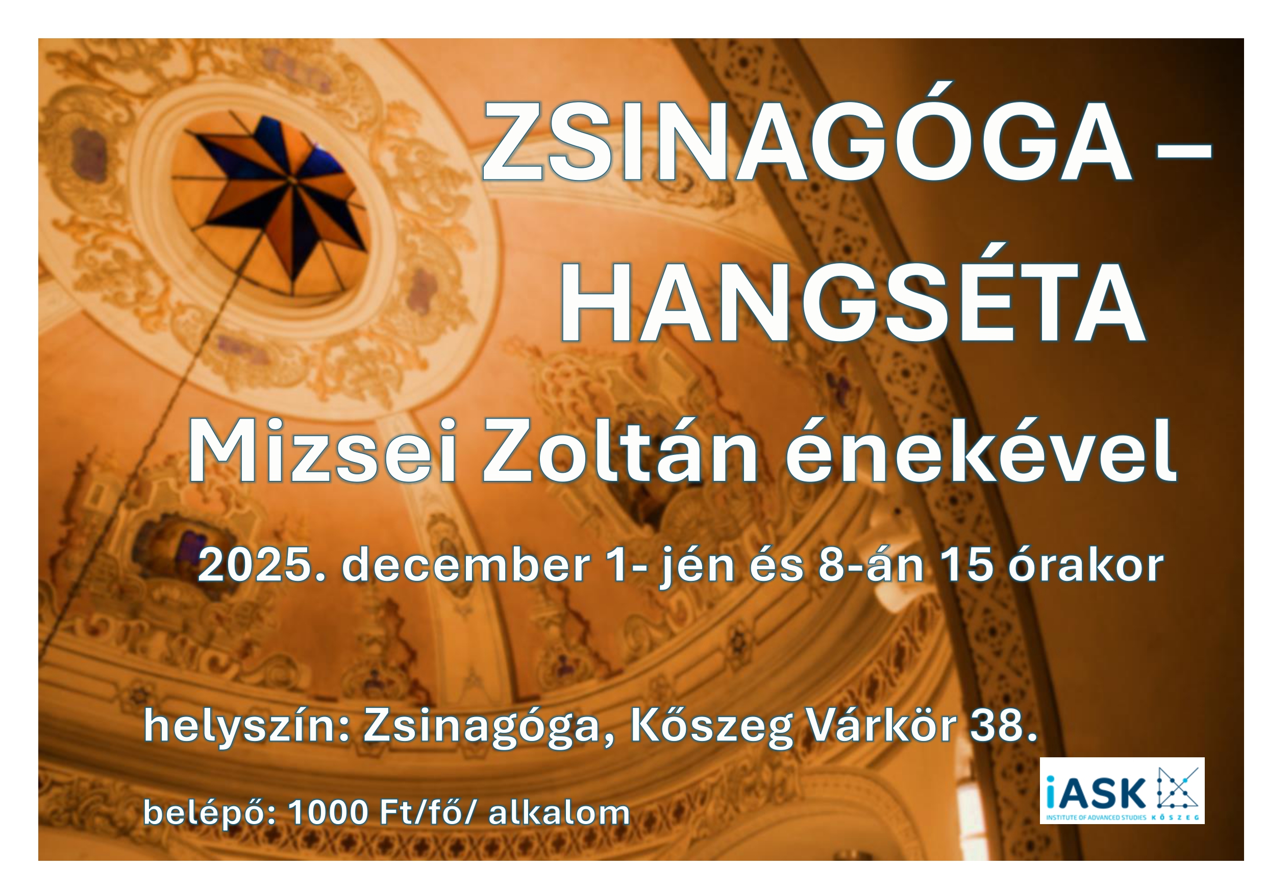 Zsinagóga hangséta plakát Mizsei Zoltán énekével, Kőszeg. „Zsinagóga – Hangséta” felirat.