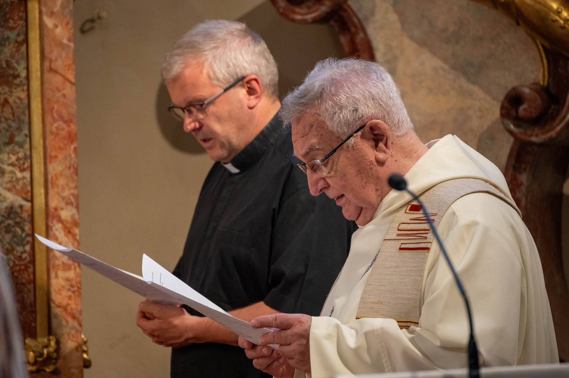 Két pap olvas egy papírról a Keresd a békét és járj utána! ünnepi beszéd közben.