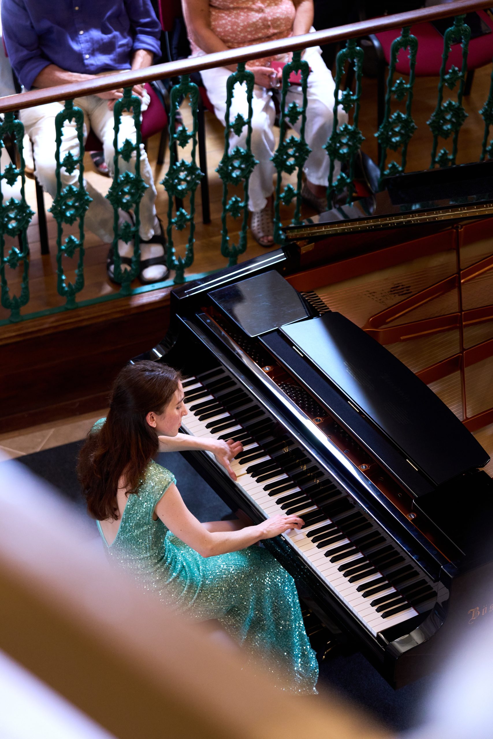 Zongorán játszó nő csillogó ruhában, nézők a háttérben. A "Valóban hidakat építünk" bloghoz.