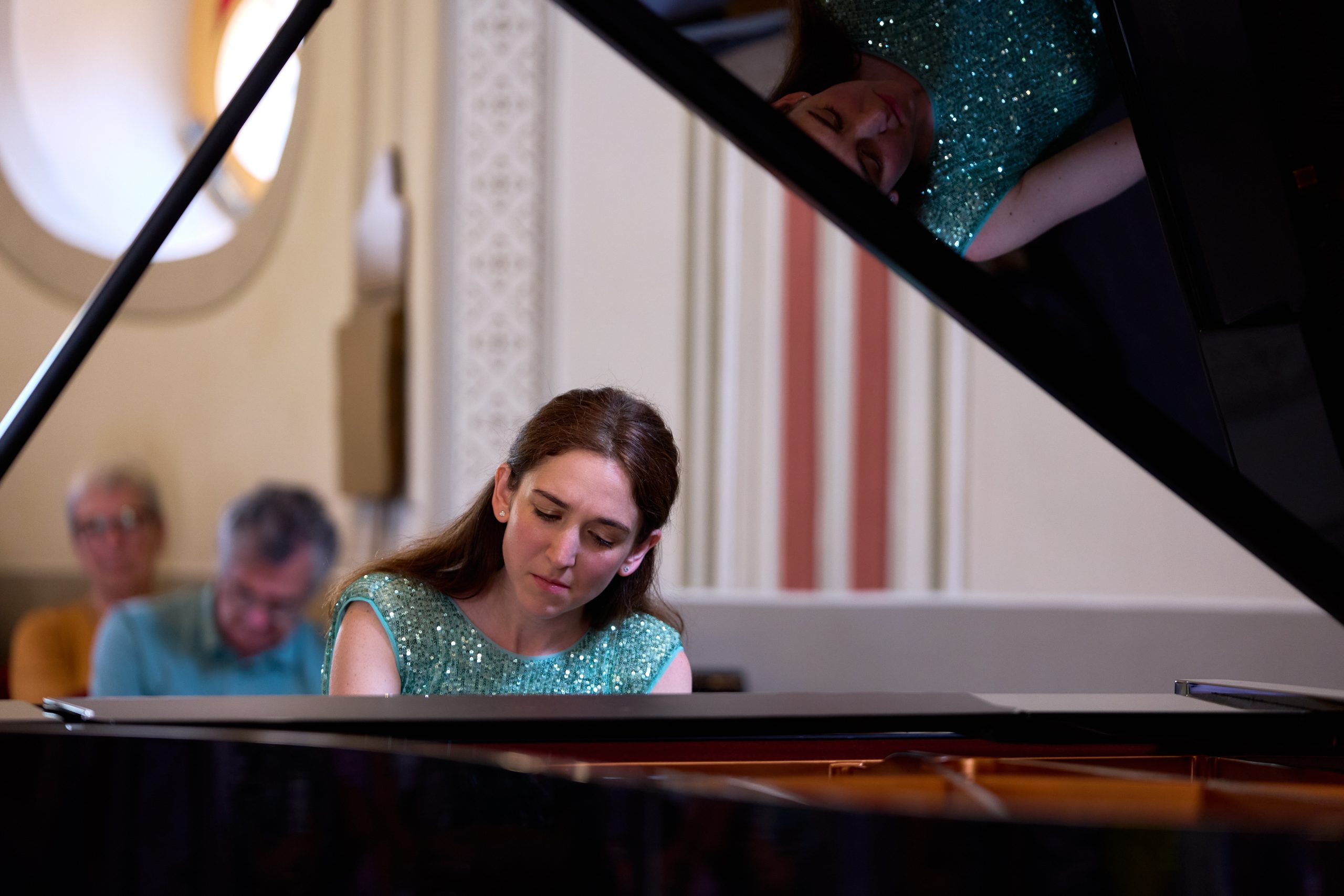 Zongorán játszó nő csillogó ruhában, a "Valóban hidakat építünk" bloghoz.